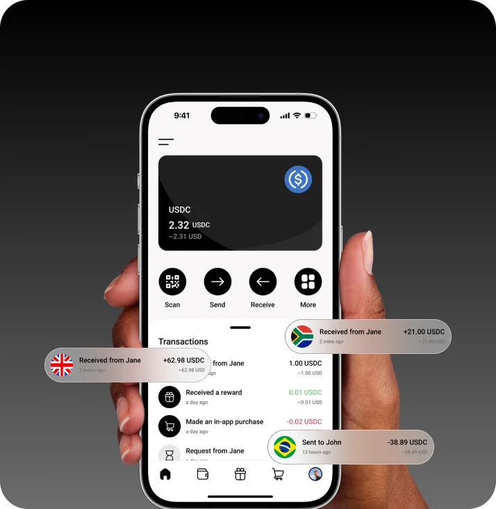 Receive via ACH, Wire, SEPA, SPEI, or Pix — balances are held securely in USDC.
